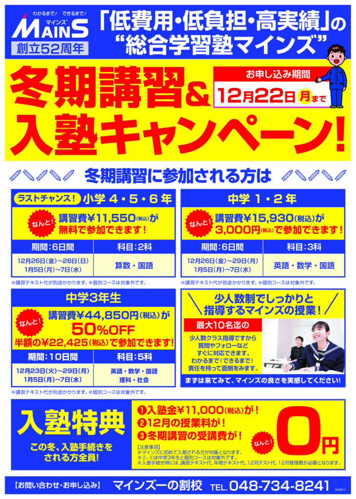 この冬、マインズ一の割校に入塾される方は、入塾金が11,000円(税込)→0円!、12月の授業料→0円!、冬季講習の受講費→0円!など様々なキャンペーン特典がございます。